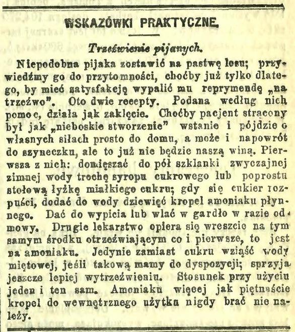 Lekarstwo to z gatunku tych, które mogą bardziej zabić niż wyleczyć! Uważne oczy wypatrzą w tej krótkiej „poradzie” wyraz niepoprawny nawet w tamtych czasach, choć często w tej niepoprawnej formie występujący. Co akurat w „Kurierze Warszawskim” z roku 1885 powinno dziwić, jako że w 1882 rozstrzygał już tę kwestę, dość surowo.