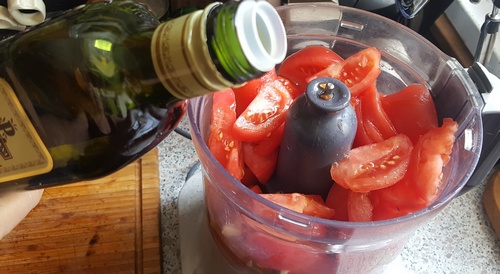 Pomidory zanurzyć na chwilę we wrzątku, po wyjęciu obrać ze skórki (można usunąć z nich pestki; ja tego nie robię). Pokroić. Przygotować bulion warzywny, przestudzić.