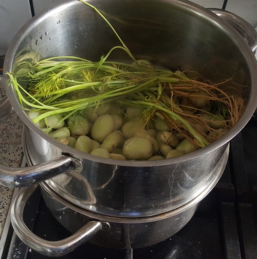 Bób ugotować na parze z pęczkiem koperku tak, aby pozostał jędrny. Po lekkim przestudzeniu wyłuskać ze skórki.