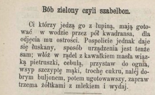Bób był jedzony przez naszych przodków bardzo chętnie. Zaliczano go do warzyw podstawowych, co odnotował Stanisław Bystroń w „Dziejach obyczajów w dawnej Polsce: wiek XVI–XVIII”: „Podstawą jednak były pokarmy roślinne, jarzyny i zboża; groch i kapusta zajmują tu naczelne miejsce, dalej bób i soczewica”. Dlatego w starych książkach kucharskich na przyrządzanie tych warzyw można znaleźć różne przepisy, ciekawe a zapomniane. Może warto je przywrócić?