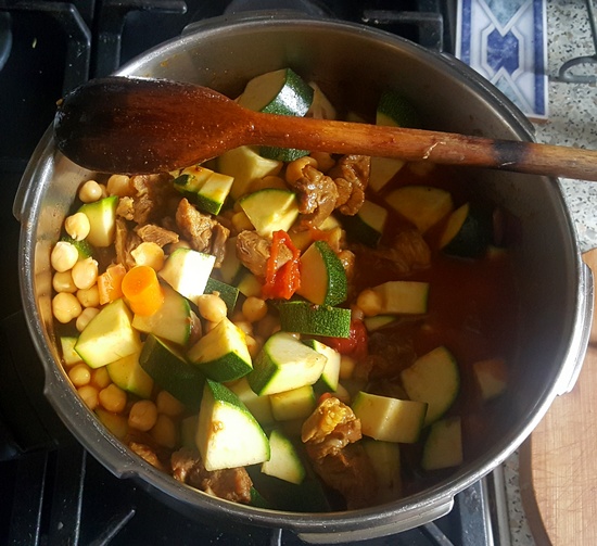 W rondlu z grubym dnem rozgrzać oliwę. Jagnięcinę pokroić w kostkę. Cebulę i pomidory pokroić w kostkę. Podobnie marchew oraz cuknie (i rzepę, jeśli się ją ma). Czosnek przesiekać lub zmiażdżyć. Ciecierzycę odcedzić, przepłukać.