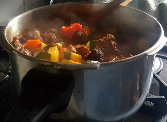 Najważniejszym dodatkiem do kuskusu była duszona z warzywami jagnięcina. I ją można już dostać, nawet w pewnym dyskoncie, nie tylko na bazarze. Moja jednak pochodziła z bazaru. Sprzedawca w mojej ulubionej budce przy Hali Mirowskiej sprzedał mi jagnięcy karczek, znakomity na gulasz, czyli danie duszone. Proporcje podaję za książką, ale opis jest już mój. Egzotyczne przyprawy można dostać w sklepach typu Kuchnie świata (także internetowych) lub na półkach hipermarketów. Wśród warzyw występuje rzepa (franc. navet), u nas. niestety, nieobecna o tej porze roku; pominęłam ją.