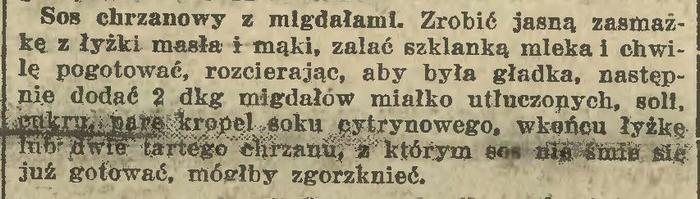 W roku 1938 „As” ukazał zaś sos bardzo oryginalny. Do chrzanu dodaje się jabłka. Przepis zawiera też uwagę praktyczną dotycząca korzenia surowego chrzanu.