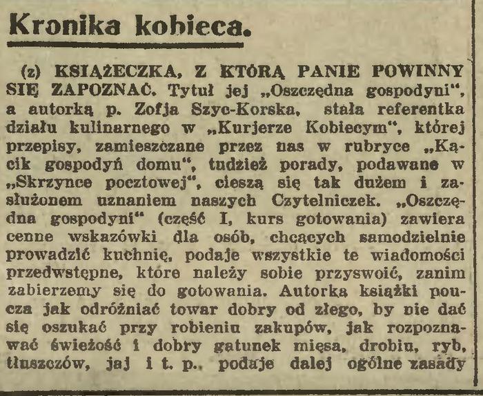 Sos znalazłam w roczniku „Ilustrowanego Kuryera Codziennego”, nazywanego IKaCem, największej przedwojennej gazety w naszym kraju. Z roku 1935. Dział kulinarny tej gazety wydawanej w Krakowie, a popularnej i chętnie kupowanej w całym kraju, ukazywał się raz w tygodniu na łamach działu kobiecego. Prowadziła go Zofia Szyc-Korska, autorka książek kucharskich w tym tej reklamowanej na łamach… własnej gazety.