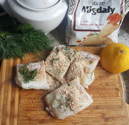 Filety pokroić na porcje. Każdą posolić i skropić sokiem cytrynowym. Panierować w startych migdałach i posiekanym koperku.
