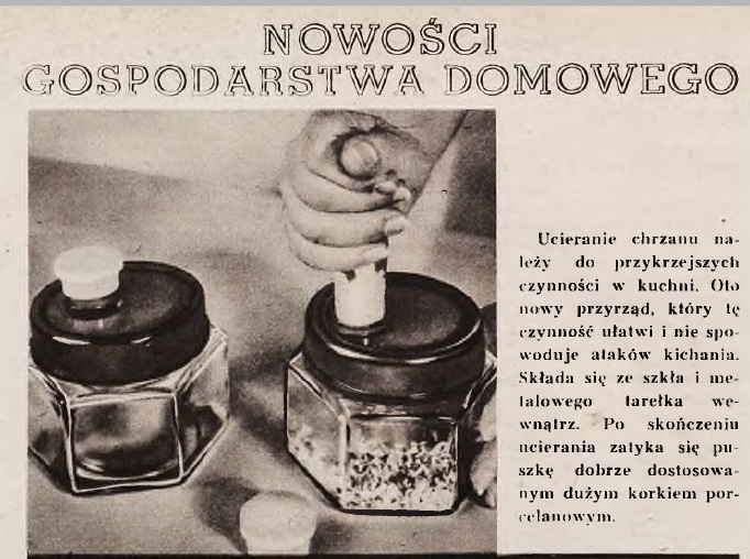 Sosów chrzanowych polska kuchnia zna bez liku. W poradach pani Szyc-Korskiej znalazłam ich wiele. Musiała je lubić, skoro tyle razy opisywała. A może czytelniczki sobie życzyły? Przepisy (a podam wcale nie wszystkie!) pochodzą z IKaCa oraz z magazynu należącego do tego samego koncernu, czyli z bogato ilustrowanego „Asa”. Do sporządzania sosów używano surowego korzenia chrzanu. Jego tarcie było mozolne, zwłaszcza ze względu na piekące olejki eteryczne. Mam w oczach mojego Dziadziusia trącego chrzan przed Wielkanocą przy otwartym oknie. Tych, którzy chrzanu używali dużo, mogła zainteresować specjalna tarka, jaką pokazał „As” w roku 1937.