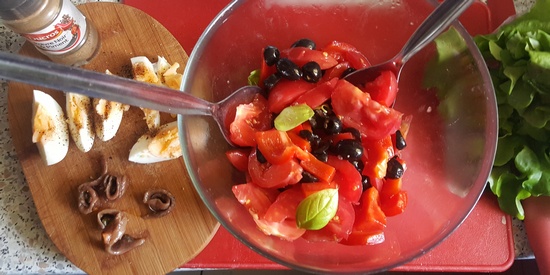 Pomidory pokroić w ósemki. Podobnie jajka ugotowane na twardo i przestudzone. Sałatę umyć, odstawić, przykryć, by nie wyschła. Odcedzić oliwki, wyjąć ze słoiczka kilka filecików anchois. Oderwać listki bazylii. W salaterce ułożyć pomidory, oliwki i anchois.