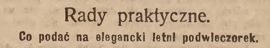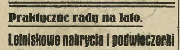 Kwestja, jak nakryć stół i co podać na podwieczorek w okresie mieszkania na letnisku, albo też pod miastem w dworkach i willach, często niepokoi panie domu. Dobrze więc będzie zestawić pokrótce, jakie są w takich warunkach wymagania estetyki, klimatu i – żołądków.