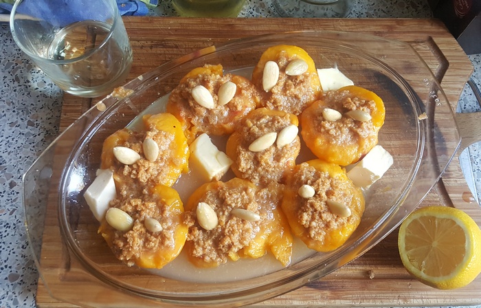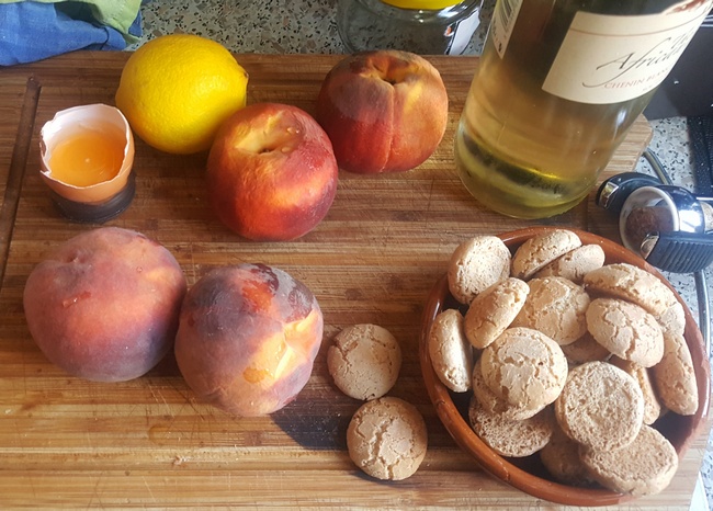 Owoce sparzyć, obrać ze skórki. Usunąć ze środka nieco miąższu. Ciasteczka rozkruszyć, nasączyć 2–3 łyżkami wina. Wymieszać z żółtkiem, ew. z cukrem (uwaga, ciasteczka są bardzo słodkie!) i sokiem z cytryny. Wypełnić farszem połówki brzoskwiń. Przybrać migdałami.