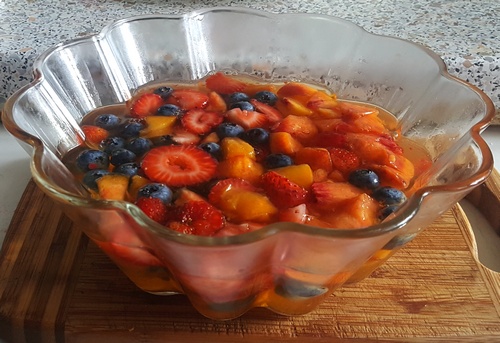 Proste, smaczne, efektowne. Kto nie chce skrapiać owoców alkoholem, może je zalać dowolną dopasowaną smakiem i kolorem galaretką i zastudzić w lodówce. Do galaretki można podać śmietanę: słodką płynną lub ubitą na krem. Albo kulkę lodów.