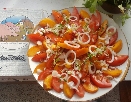Aby nie było za słodko, przedstawię jeszcze jedno połączenie, tym razem niebanalne, do podania podczas obiadu. Będzie znakomitą sałatką. Wytrawną. Można ją podać do dań z mięsa, do sera, do ryb. To sałatka z brzoskwiń i pomidorów.