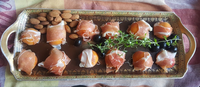 W wersji bez chleba można podać zawijaski z szynki z morelami. Dla tych, którzy lubią pochrupać podajmy je z migdałami. Migdały do nich można obrać ze skórki, ale wcale nie trzeba.