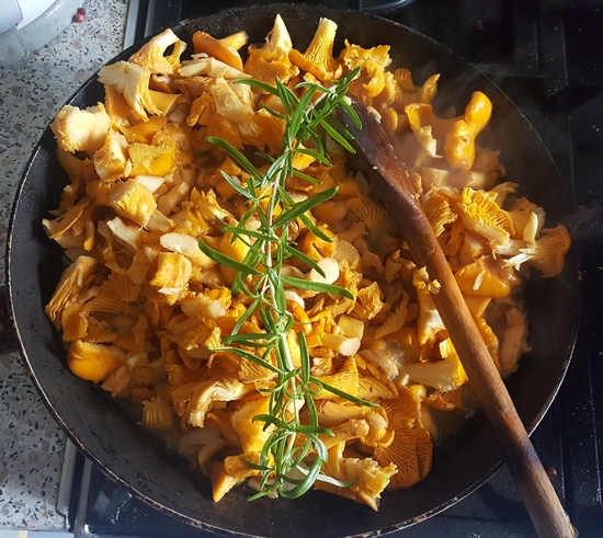 Myjemy je starannie, jak opisał „Bluszcz”. Końcówki korzonków odcinamy. Ja następnie odsączam je w wirówce do sałaty, delikatnie odwirowując czystą już wodę. Takie kurki duszę w maśle lub mieszaninie oliwy z odrobiną masła z pokrojoną drobna cebulą (raczej małą i raczej słodką). Tym razem do duszenia dodałam rozmaryn.
