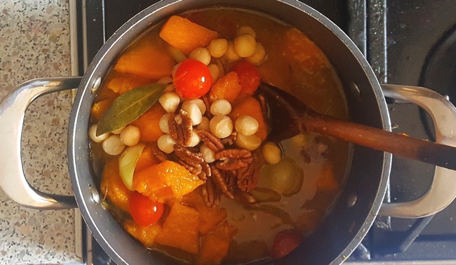 Warzywa zalać bulionem, wrzucić listek laurowy. Dusić przez kolejne 10–15 minut, aż dynia zmięknie. Dodać połówki pomidorków oraz orzechy. Doprawić włoską przyprawą pikantną oraz przyprawą korzenną. Dusić jeszcze 5 minut. Posolić, lekko posłodzić. Podawać na gorąco.