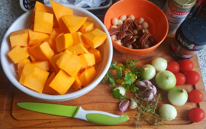 Została mi połowa dyni, którą zużyłam na zupę. Co z niej ugotować? Może dyniowy gulasz? (Nazwy „gulasz” używam nieprecyzyjnie, w potocznym wyrażeniu na oznaczenie potrawy pokrojonej w kostki i duszonej, z węgierskim gulaszem nie ma nic wspólnego). Wymyśliłam go od a do z. Potrawa prosta, cały smak zwiera w kombinacji przypraw. Przyrządzimy ją w małe pół godzinki.