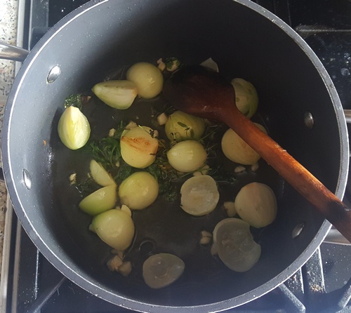 Oliwę rozgrzać, wrzucić cebulki przekrojone na pół i posiekany czosnek. Zeszklić, nie rumienić.