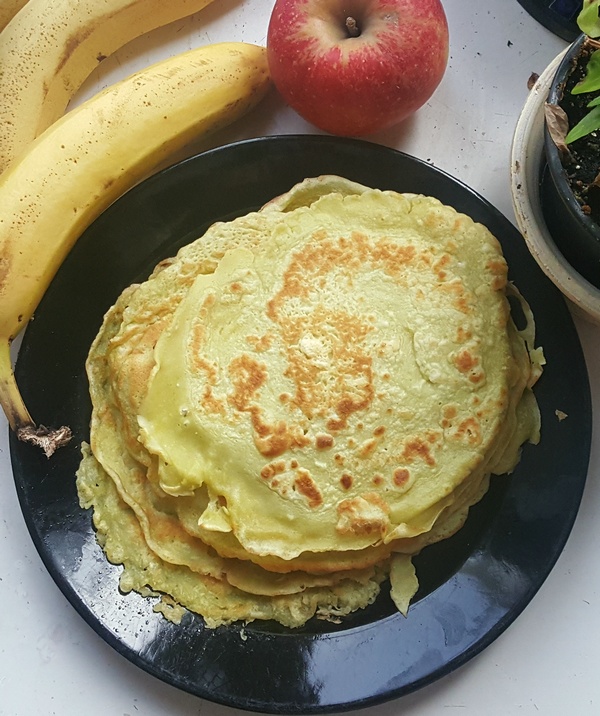 Ten gulasz z dyni podałam do naleśników. Były nietypowe, bo przyrządzone z mąki pszennej z dodatkiem mąki z zielonego groszku.