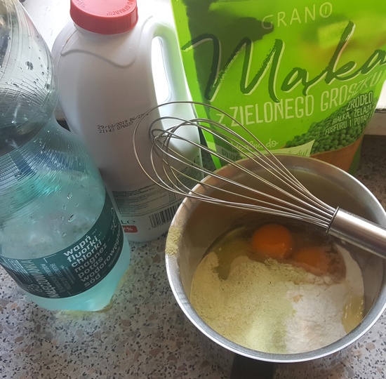 Przepisu na naleśniki nie podaję, bo łatwo go znaleźć gdzie indziej, ale dopowiem, że do obu rodzajów maki dodałam dwa jajka, wodę gazowaną, mleko oraz sól i odrobinę oleju. Ciasto naleśnikowe dobrze jest odstawić na pól godzinki, by odpoczęło. Smażymy na dobrze rozgrzanej patelni bardzo lekko posmarowanej olejem. Na drugą stronę odwracamy, gdy spodnia się już lekko zazłoci.