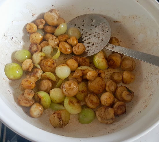Na patelni rozgrzać łyżkę oliwy i 2 łyżki masła. Obsmażyć cebulki, wyjąć, obsmażyć pieczarki (oczyszczone ze skórki).