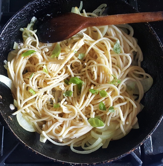 Na głębszej patelni o grubym dnie rozgrzać oliwę, zeszklić w niej półplasterki cebuli i posiekany czosnek (nie rumienić). Dodać makaron, wymieszać, na małym ogniu odgrzewać, ale nie podsmażać. Domieszać przyprawy ziołowe i pieprz, jeśli trzeba posolić. Wmieszać listki bazylii.