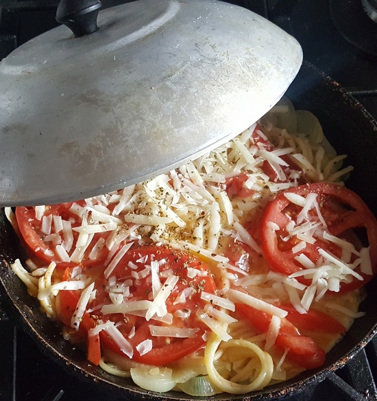 Gorący makaron zalać rozkłóconymi jajkami, pokryć plastrami pomidora, posypać tartym serem, a z wierzchu pieprzem. Przykryć pokrywką.