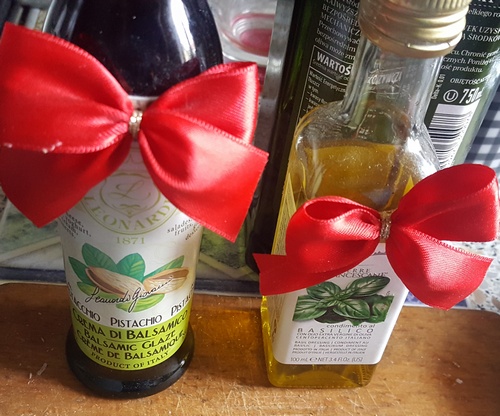oliwa o smaku bazylii, ocet balsamiczny np. pistacjowy
