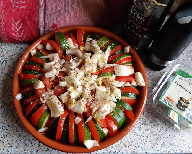 Pomidory i cukinie pokroić w plasterki mniej więcej jednakowej grubości. Okrągłe naczynie do zapiekania skropić oliwą. Plasterki warzyw układać na sztorc i w krąg. Wypełnić całe naczynie.