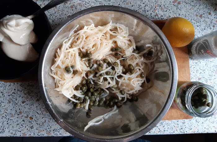 Kapary odcedzić, posiekać. Paseczki selera wymieszać z kaparami.