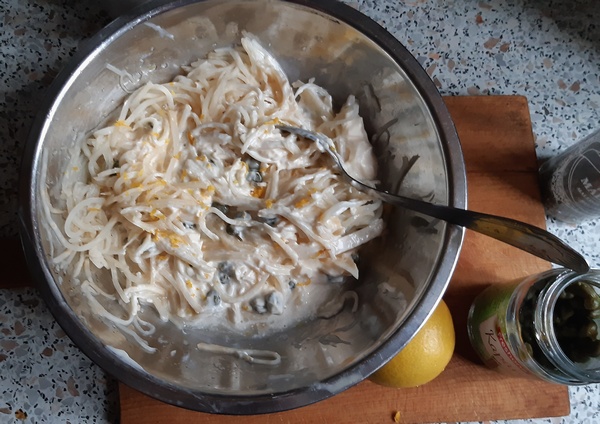 A ja z selera przyrządziłam sałatkę. Bardzo prosto. Podałam ją jako dodatek do wędlin. Bardzo ją polecam! Jest znakomitym i efektownym dankiem do podania nieoczekiwanym gościom. Przyrządzimy ją w mig, gdy się zaopatrzymy w słoiczek z podgotowanym selerem w sosie własnym. Są takie na półkach z konserwami warzywnymi. Warto poszukać. W przeciwnym razie seler (cały lub część) trzeba podgotować: obrać, zetrzeć w paski, ugotować w osolonej wodzie, po odcedzeniu wymieszać z sokiem z cytryny.