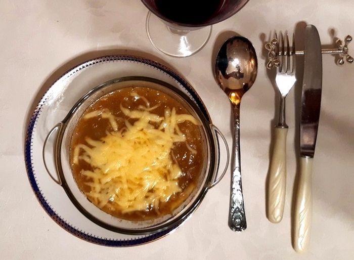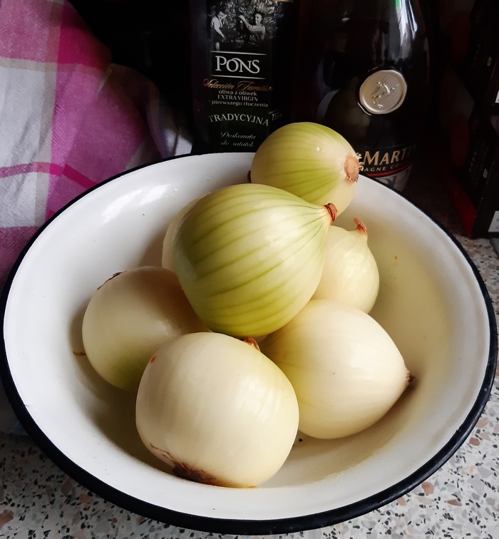 Zimą zawsze nabieram ochoty do ugotowania zupy cebulowej. Odwiedziny przyjaciół były znakomitym pretekstem do spełnienia tej chętki. I chociaż zimy w tym roku nie ma, zupa cebulowa wjechała na stół! To całe sążniste danie. Jest pożywna, rozgrzewająca, w czasie przeziębień zadziała profilaktycznie, chroniąc przed wirusami. I niezmiennie jest smaczna. Zaletą jest i to, że przygotować ją da się bardzo łatwo. Byle przebrnąć przez krojenie cebuli. Komu od eterycznych olejków cebuli silnie łzawią oczy, a nie ma pomocników, niech to zrobi przy otwartym oknie.