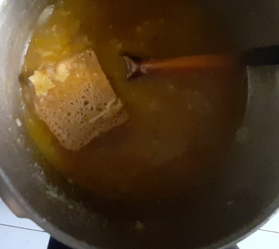 Po kwadransie wrzucić kromkę chleba. Gdy nasiąknie płynem, rozetrzeć ją dokładnie (można użyć sitka).