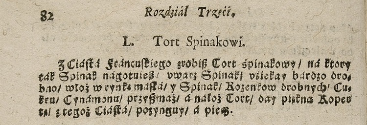 Niełatwo czyta się te zawijasy, prawda? Przepis opisuje wyłożony na ciasto szpinak duszony, ale przyprawiony na słodko: z rodzynkami, cukrem i cynamonem. Czy by nam smakował? Nasi przodkowie bardziej niż my lubili smaki słodkie i mocno korzenne.
