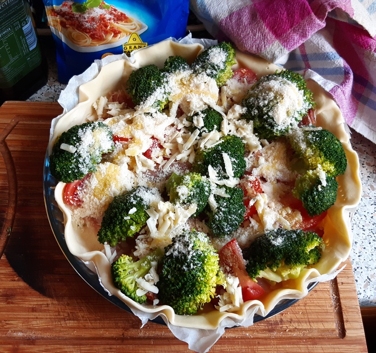 Ciastem wyłożyć formę na tartę i nakłuć je widelcem. Brokuły podzielić na różyczki (łodygi zostawić np. do zupy), obgotować je w posolonej wodzie przez 5 minut, odcedzić (wywar także jest dobry na zupę), nieco schłodzić. Pomidora pokroić w plastry lub ćwiartki (można obrać go ze skórki, ale nie potrzeba).