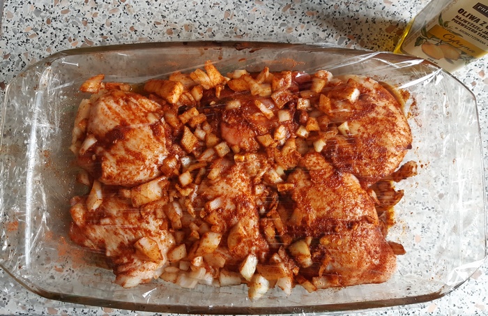 Kurczaka posypać pokrojoną w kostkę cebulą i posiekanym czosnkiem. Natrzeć przyprawą i oliwą. Wetrzeć przyprawy rękami. Przykryć folią, odstawić na noc lub kilka godzin.