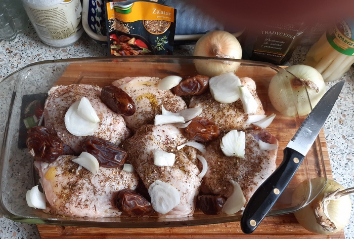Dno i boki naczynia do pieczenia przetrzeć oliwą. Kurczaka obmyć, osuszyć. Natrzeć zatarem i oliwą. Ułożyć w naczyniu, obłożyć daktylami. Odstawić na pół godziny (można na noc). Piekarnik nagrzać do 220 st. Piec kurczaka 20 minut, po 10 obrócić.
