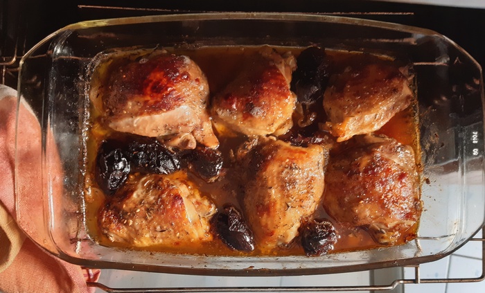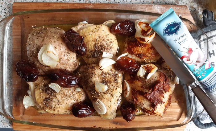 Udka, które mają być pikantne, posmarować harissą. Ponownie wstawić do piekarnika z temperaturą obniżoną do 180 st. Podlać odrobiną wody. Dopiec kurczaka przez ok. kolejne 20 minut podlewając go wytworzonym sosem. Na ostatnie 5 minut można włączyć górny opiekacz i zwiększyć temperaturę, wtedy skórka stanie się chrupiąca.