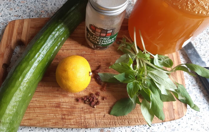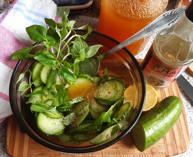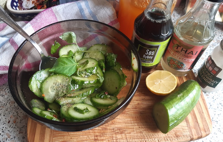 Sos rybny można zastąpić sosem sojowym, ale jasnym. Surówka nie potrzebuje już soli. Zestaw przypraw można dostosować do zawartości swojej półeczki z przyprawami. Ważne, by surówka była słodko-kwaskowa i nieco pikantna. Ma odświeżyć nasz smak. Jest to zasługą nie tylko samego świeżego ogórka, ale i tajskiej bazylii. Bardzo się ucieszyłam, gdy ostatnią ją spotkałam w moim sklepie. Uwielbiam jej lekko anyżkowy smak. Pasuje do wszystkich dań z Dalekiego, ale i Bliskiego Wschodu.