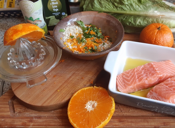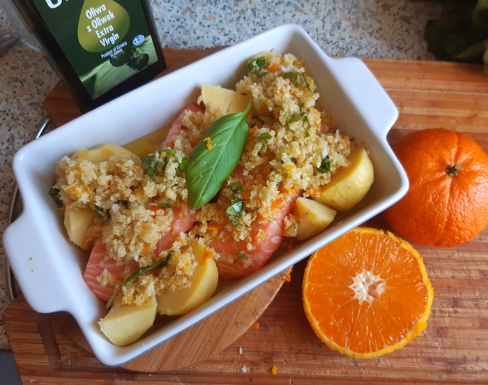 Filety, jeśli są ze skórą, oczyścić z ości. Naczynie do zapiekania posmarować oliwą, ułożyć filety skórką do dołu. Z 2 łyżek bułki (na dwa małe filety), oliwy, soku z ok. połowy mandarynki i startej z niej skórki (po sparzeniu) sporządzić panierkę. Wymieszać z posiekanymi listkami bazylii lub natką.