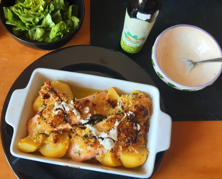 Tę rybę, jak widać, obłożyłam połówkami ugotowanych w mundurkach ziemniaków. Także je pokryłam panierką. Do ryby podałam dość rzadki sos ukręcony z majonezu, soku z mandarynki i posiekanych listków bazylii.