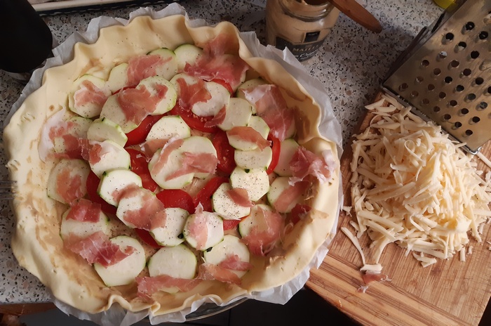 Ciasto rozłożyć w foremce do pieczenia tarty (zgodnie z opisem na opakowaniu ciasta, zostawić papier do pieczenia), posmarować musztardą, popieprzyć. Cukinię i pomidory pokroić w plasterki. Szynkę rozdrobnić na kawałki. Wyłożyć warzywa.