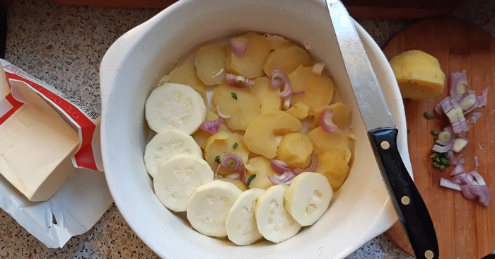 Naczynie żaroodporne wysmarować masłem. Ułożyć warstwę ziemniaków, posypać cebulką, a na tym rozłożyć plasterki cukinii. Tak ułożyć kilka warstw (ile potrzeba, by wykorzystać warzywa), przesypując je pieprzem.
