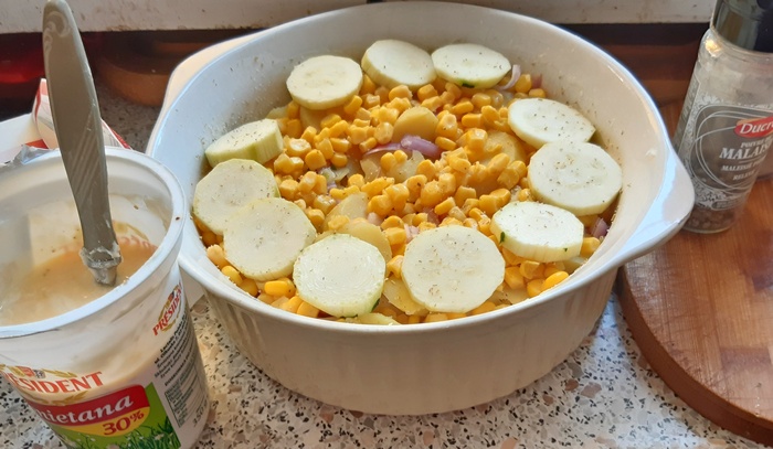 Cukinię pokroić (obrać lub skórkę zostawić) w plasterki, Tak samo pokroić obrane ze skórki ziemniaki. Kukurydzę odcedzić. Cebulki pokroić cienko. Śmietanę wymieszać jajkami, solą (umiarkowanie) i pieprzem.