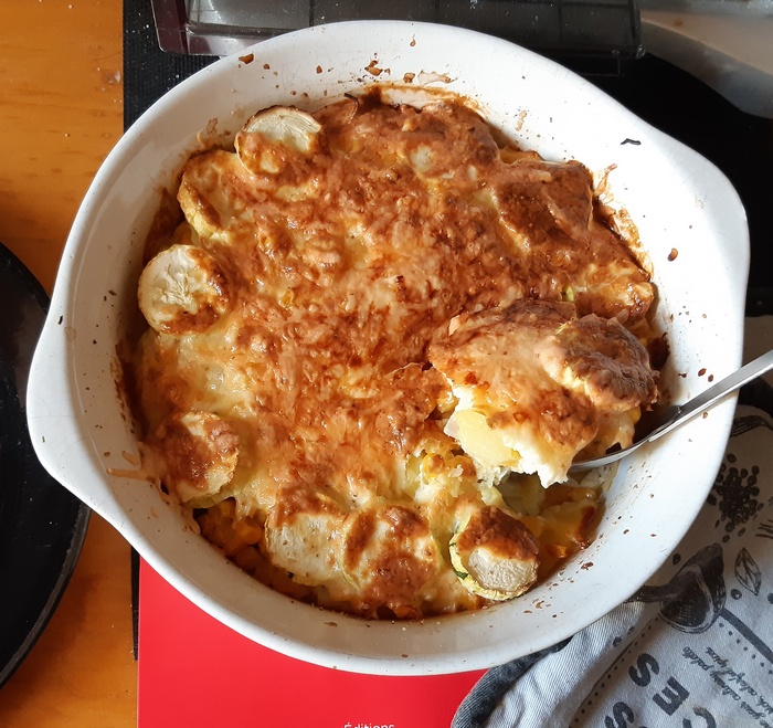 Podając zapiekankę wycisnęłam na nią smużkę octu balsamicznego. Polecam, byle tego gęstego octu nie dawać za dużo! Oczywiście, warzywa można przesypywać ulubionymi ziołami – oregano, bazylią, estragonem, swojskim majerankiem. Zamiast pieprzu można wziąć paprykę. A surową paprykę, pokrojoną w paski, dodać do zestawy warzyw. Zamiast kukurydzy można wziąć pokrojone w plasterki pomidory. A w ogóle dodawać na co nam możliwości pozwalają, a wyobraźnia dyktuje. To cały urok zapiekanek.
