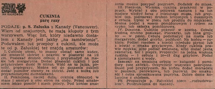 To nie koniec. Zakończenie będzie dla amatorów cukinii. Garść przepisów na jej przyrządzanie podsunęła czytelniczka „Przekroju” w roku 1977. W rubryce „Jedno danie” podał je zasłużony redaktor tej rubryki Jan Kalkowski.