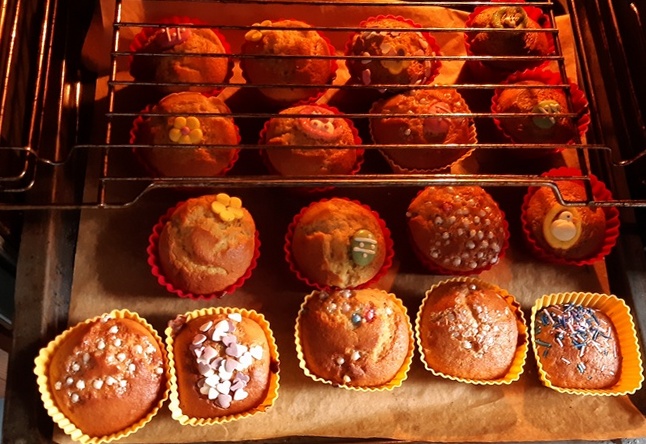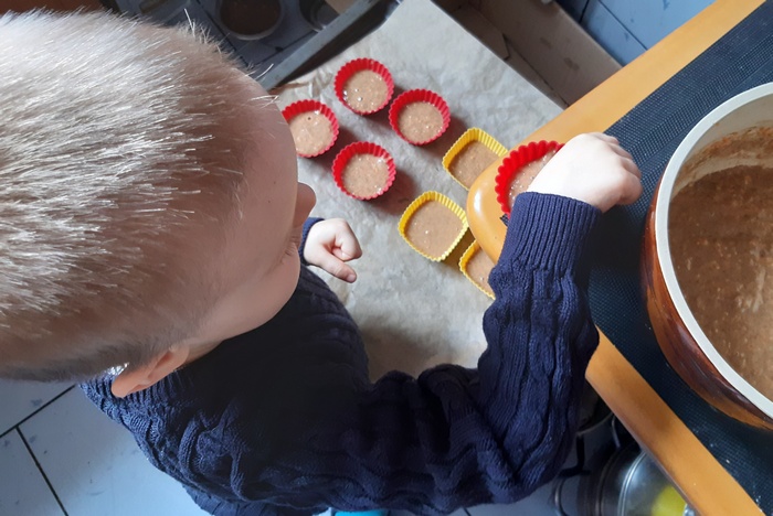 A deser? Najlepiej, gdy dzieci, jak mój najmłodszy wnuk, przygotują go z naszą pomocą. U mnie są to babeczki, czyli muffiny. Piekły je jeszcze ze dwa-trzy lata temu starsi – Agatka i Adaś, dzisiaj przygotowuje je do pieczenia Stefan. Lubi mieszać i… zdobić. Starsi też to lubili! Za każdym razem przygotowujemy jakieś inne babeczki. Były już marchwiowe (bardzo udane!), jabłkowe, mandarynkowe, czekoladowe (Stefan wcale nie lubi czekolady, robił dla rodziców) i bananowe. Właśnie te pokażę.