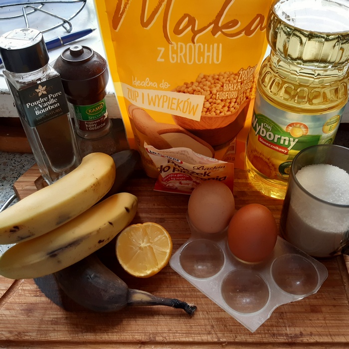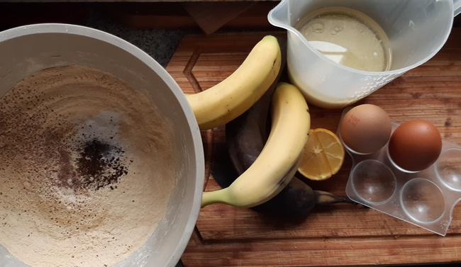 Banany obrać, zmiażdżyć widelcem. Połączyć składniki suche z mokrymi, domieszać banany, połączyć w jednolitą masę.