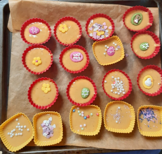 Wykładać do foremek. Zdobić cukrowymi posypkami, listkami z czekolady itp., jak fantazja dyktuje.