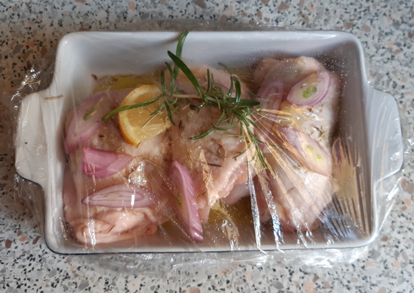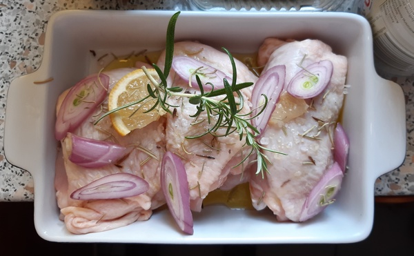 Udka obmyć, osuszyć, natrzeć suszonym rozmarynem i solą oraz sokiem z cytryny i skropić oliwą. Obłożyć szalotką pokrojoną w plasterki oraz rozmarynem świeżym.