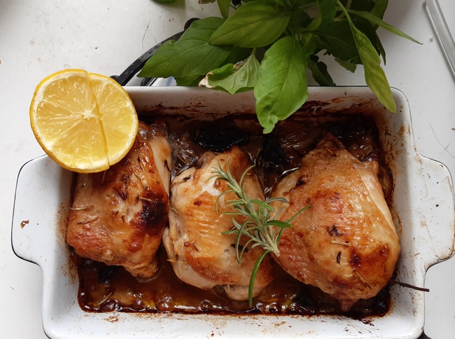 Piec ok. 30–40 minut w 160 st. C. 5-10 minut przed zakończeniem pieczenia zwiększyć temperaturę do 200 st., obłożyć udka kawałeczkami świeżego masła. Podawać obłożone świeżym rozmarynem, z plasterkami lub ćwiartkami cytryny (wyjąć pestki).