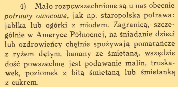 A może dzieci lubią inne słodkie potrawy? W dwutygodniku „Pani Domu” w roku 1935 Maria Morzkowska, podpisująca się jak dietetyczka, w sposób swoisty, zgodny z duchem czasu, propagowała podawanie warzyw i owoców, także dzieciom. Pisała, że „Sałaty i kompoty z owocówsą znacznie kosztowniejsze niż sałaty z jarzyn, ale też nie potrzeba ich podawać do każdego jadłospisu. Podawane w niewielkiej ilości, stanowią smaczny i efektowny dodatek do obiadu lub deser na zakończenie kolacji. Należy pamiętać, że koszt owoców nie jest zbyt wygórowany w stosunku do ich wartości, o ile kupujemy owoce w sezonie odpowiednim dla każdego gatunku”. Co w naszych czasach tak się zmieniło dzięki szklarniowym uprawom krajowym i dzięki globalizacji, a więc skurczeniu się świata (czy pandemia tego nie zmieni, nie przyhamuje?). Proponuje dalej na przykład takie potrawy, może i naszym dzieciom zasmakują?